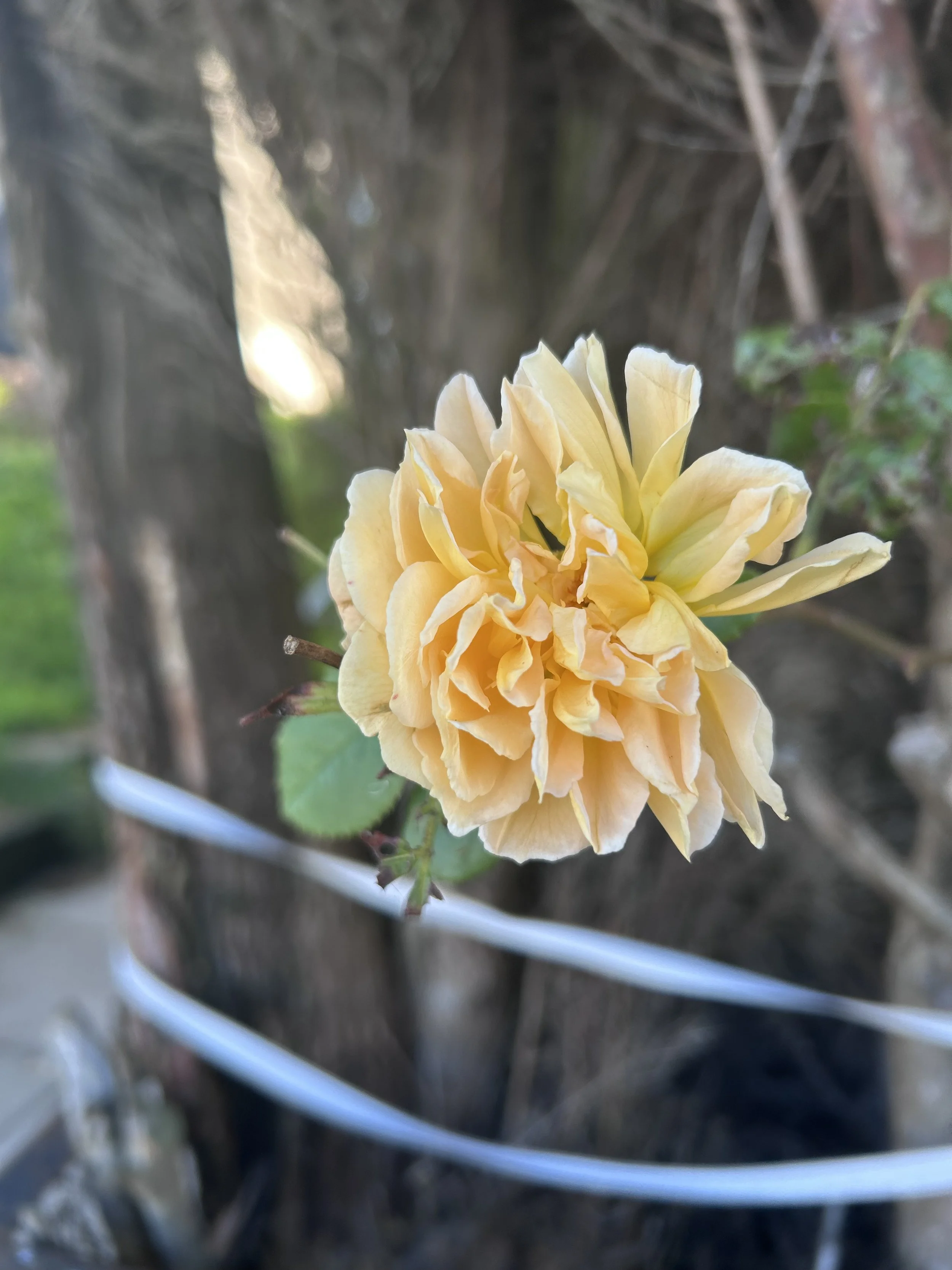 A yellow climbing rose peeking through between two tree trunks