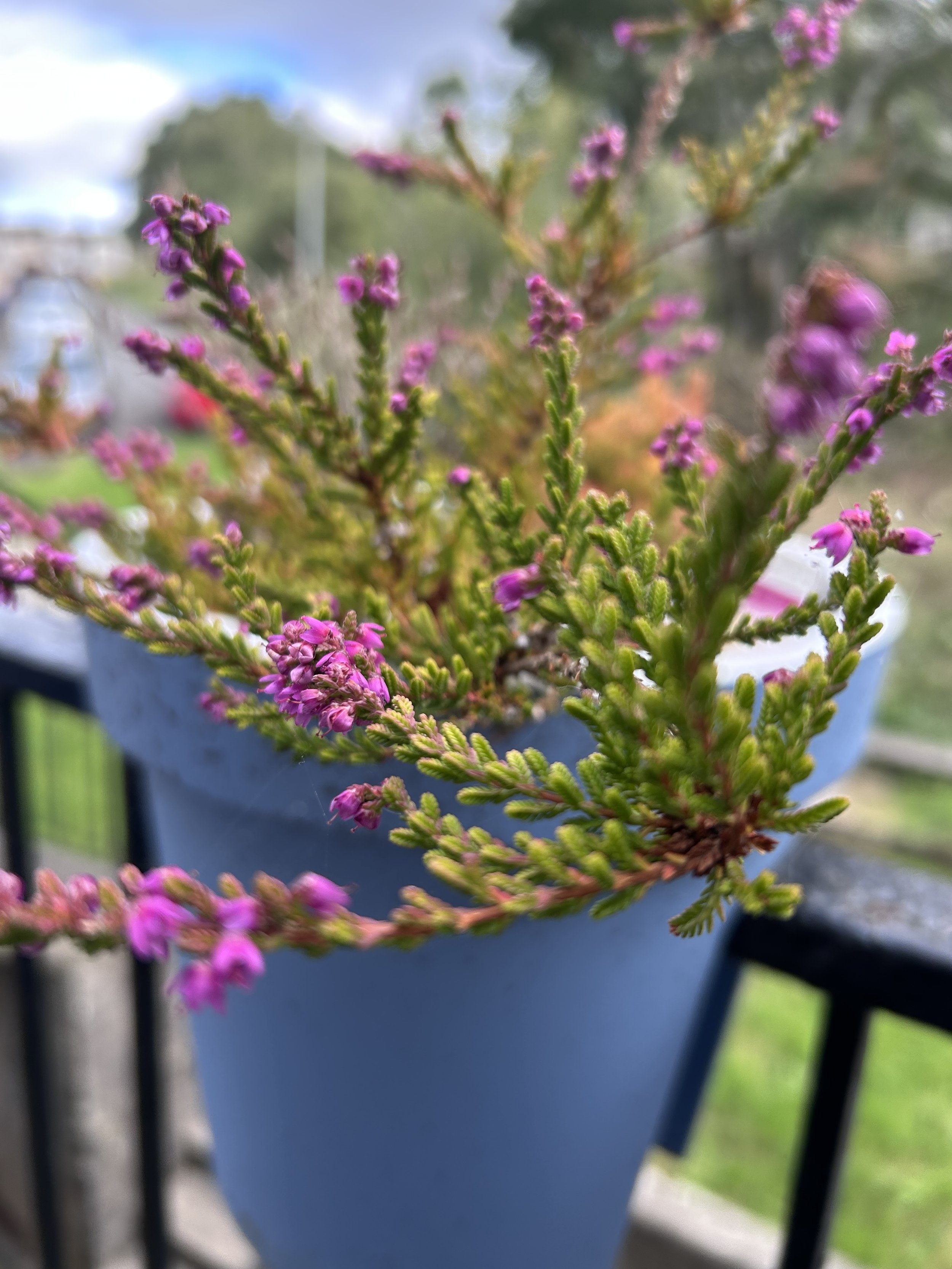 A blue over-rail plant pot with heather flowering in pink