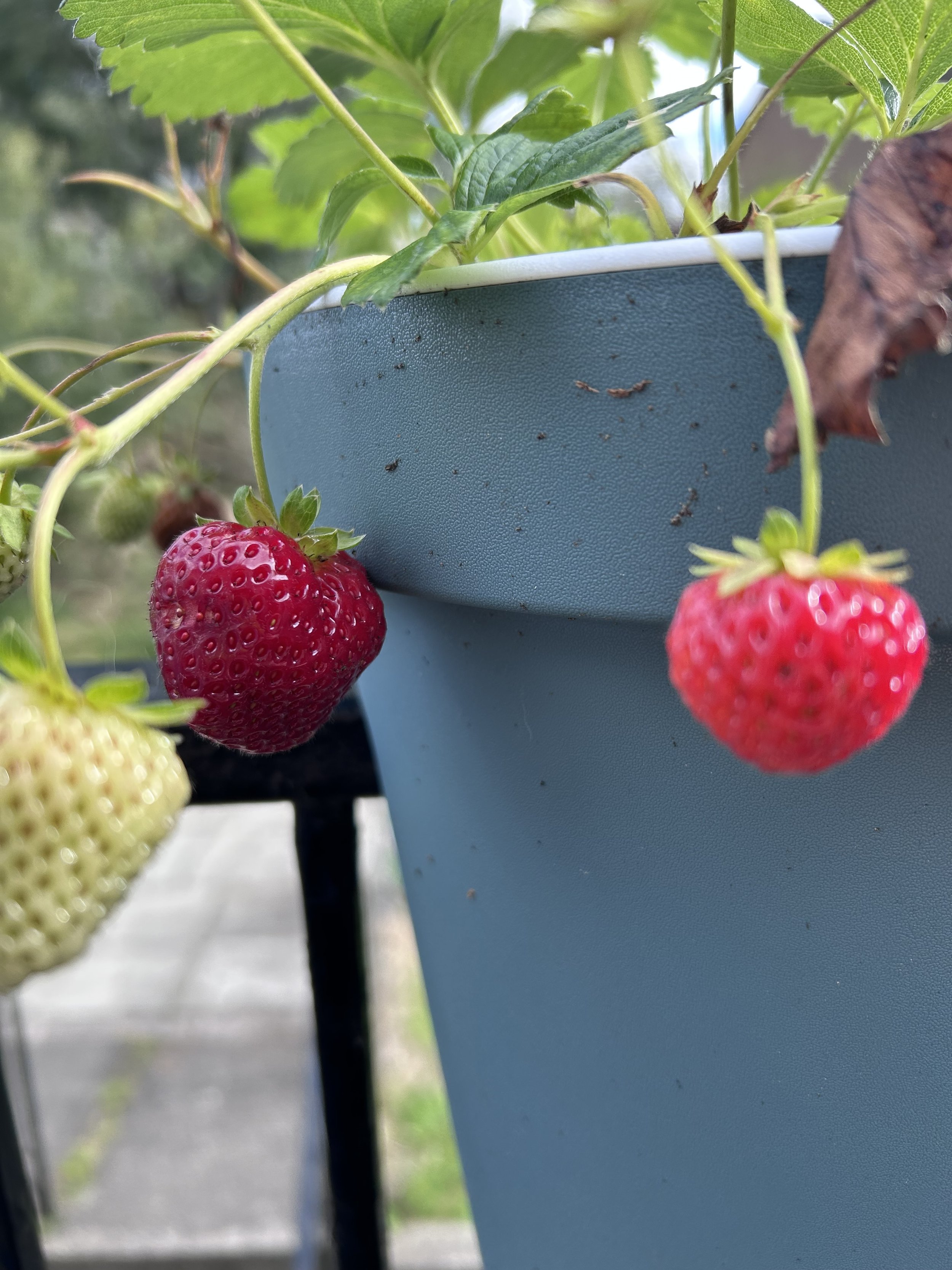 A blue over-railing pot with strawberries hanging over the side, in various stages of ripeness.